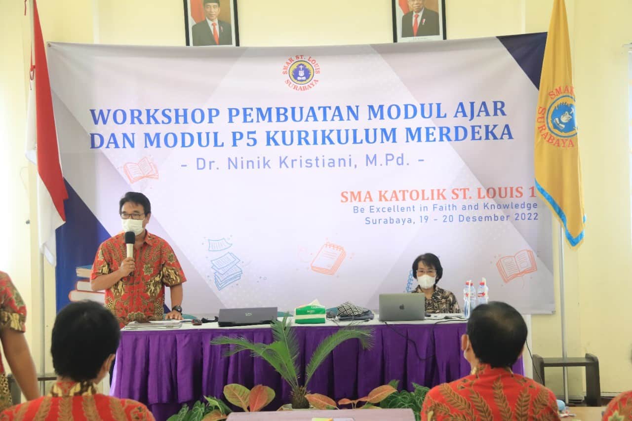 Pada 19 sampai 20 Desember 2022 SMAK St Louis 1 Surabaya mengadakan workshop dengan tema “pembuatan modul ajar dan modul P5 kurikulum merdeka.” Workshop ini diadakan untuk para guru dari SMAK St Louis 1 Surabaya dan didampingi oleh Dr. Ninik Kristiani, M.Pd. Pada workshop kali kegiatan yang diadakan antara lain adalah persiapan materi kurikulum merdeka meliputi modul ajar dan capaian pembelajaran. Dari kegiatan workshop ini diharapkan para guru SMAK St Louis 1 mampu mempersiapkan diri untuk siap menghadapi kurikulum merdeka yang mendatang.